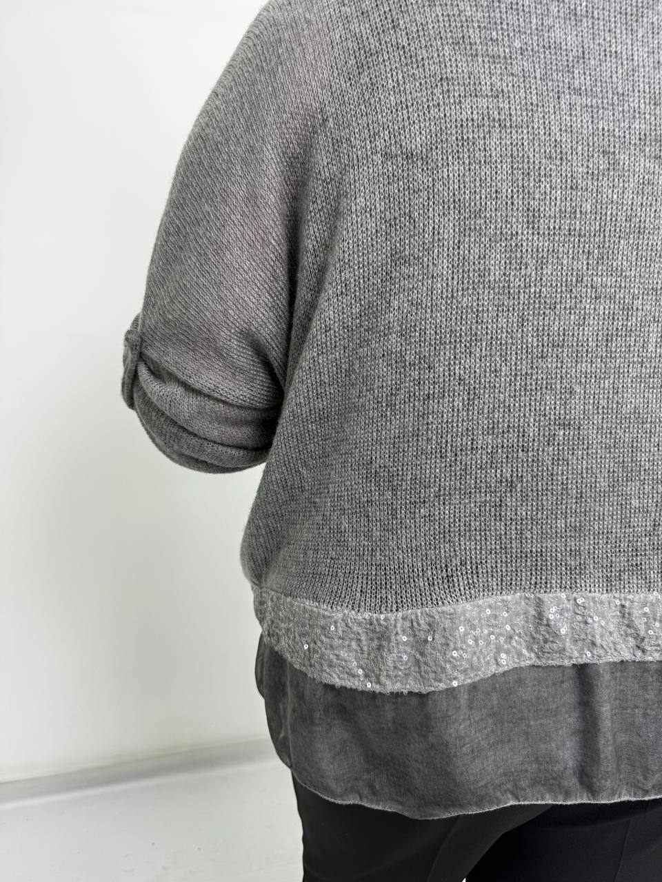 Удлинненая модель изделия по спинке. Укороченная рукав. Спинка изделия выполнена из вязанной махеровой нитки.